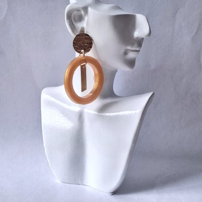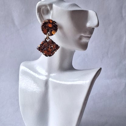 Des boucles d’oreilles en résine en forme de goutte ajourée, sublimées par un mélange intense de paillettes cuivrées aux reflets chauds et lumineux.