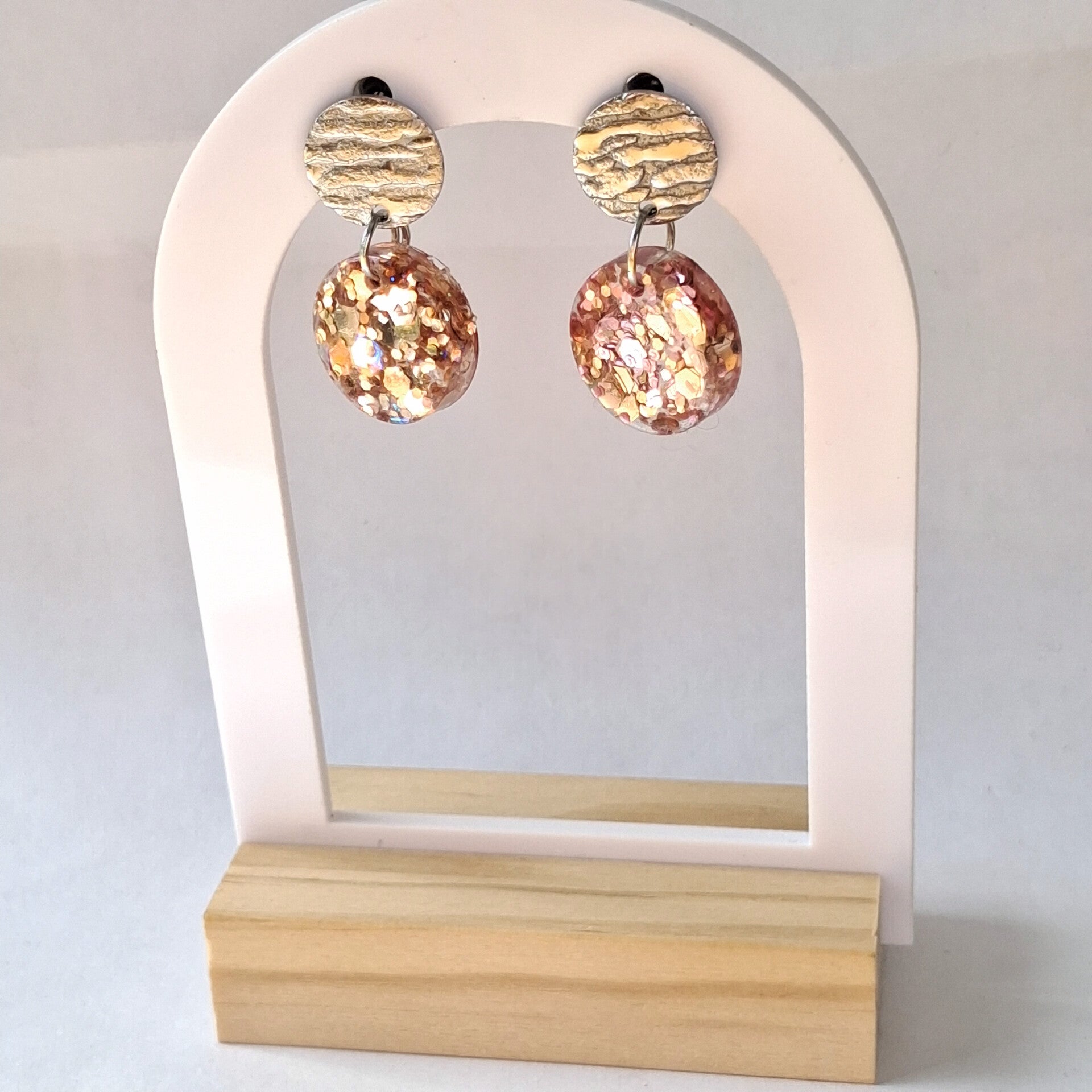 Des boucles d’oreilles en résine en forme de palet, sublimées par un mélange lumineux de paillettes aux reflets intenses.