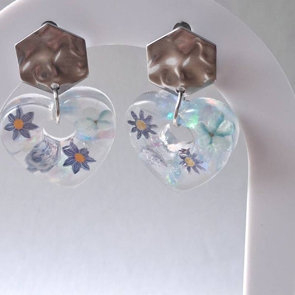 Des boucles d’oreilles en résine transparente en forme de cœur, ornées de délicates fleurs bleutées et d’inclusions irisées qui captent la lumière avec de subtils reflets nacrés.